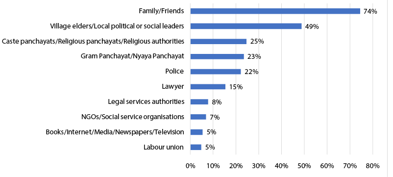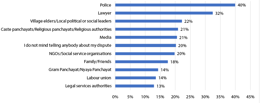 12 village elders or local leaders (49 per cent), and caste or religious panchayats (25 per cent) were in the majority, rather than lawyers, police, or legal services authorities. Further, 23 per cent of respondents said that they would rely on gram panchayats or nyaya panchayats, which is an encouraging sign about the functionality of these grassroot institutions. In contrast, when asked whom they would not approach, a large number of respondents (40 per cent) said that they would not approach the police. This was followed by lawyers (32 per cent). This is a cause of worry as it shows that people do not approach these two fundamental pillars of the justice system when it comes to disputes.