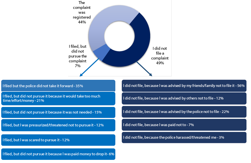 Among the respondents, 9 per cent stated that they filed or tried to file a police complaint at some point. Figure 10 tracks what happened to the complaints that respondents filed with the police. It also looks at reasons why the complaints were either not filed or not pursued after filing — which accounts for 56 per cent of all complaints made by our respondents. Of the people who did not file a police complaint, 56 per cent were dissuaded by their friends or family. Further, over one-third (35 per cent) of respondents who filed, but did not pursue the complaint, said that they did not do so because the police did not take it forward.