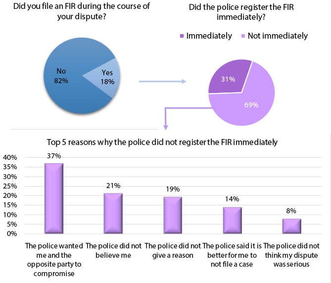 Only 18 per cent of the people who had a dispute filed a first information report (FIR). This implies that the majority of people who had a dispute did not register complaints with the police. Of those who filed an FIR, only around one-third (31 per cent) had their FIR registered immediately. The three major reasons for delays in registering FIRs (across all categories of disputes) were: (a) the police wanted a compromise, (b) they did not believe the complainant, or (c) no reason.