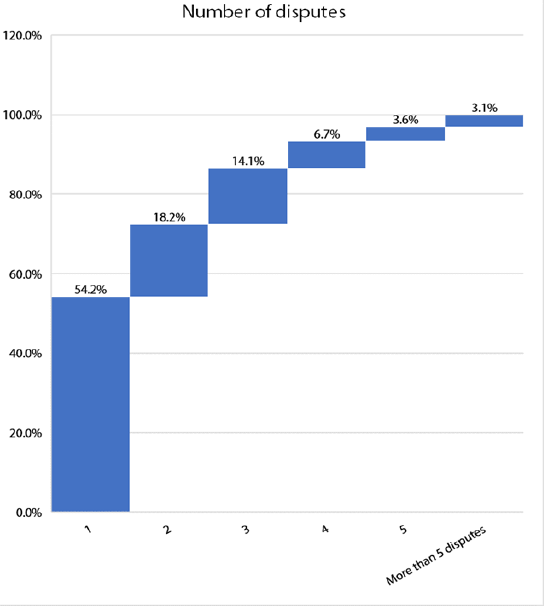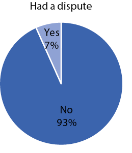 The survey records the number of disputes faced by respondents over the past five years. Figure 13 shows that of the respondents surveyed, 7 per cent stated that they had some kind of dispute over the past five years. Of these respondents, over half (54.2 per cent) had only one dispute, while around
