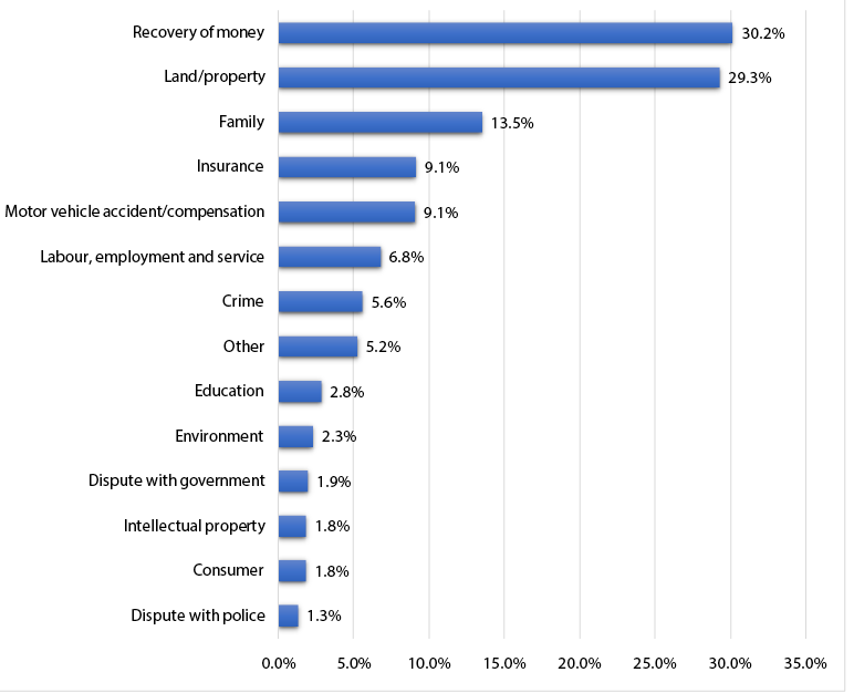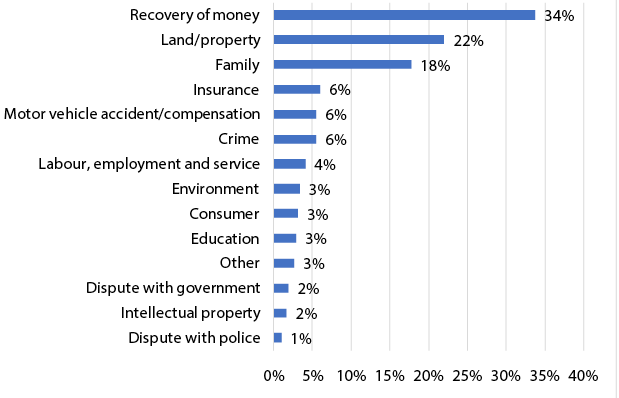 Figure 14 looks at the nature of disputes that most people face in India. Recovery of money is the most prevalent, at 30.2 per cent, closely followed by land- or property-related issues, at 29.3 per cent. Family-related cases also form a sizeable proportion of cases, at 13 per cent.