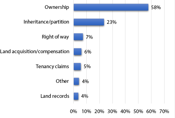 We found that the majority of respondents had disputes relating to recovery of money (30.2 per cent) and land- or property-related matters (29.3 per cent). In our survey last year, we had found that nearly 66 per cent of civil litigation stemmed from land- and property-related cases.7 In this year’s survey, most land-related disputes involved agricultural land, and the subject matter in most of these disputes (around 80 per cent) related to ownership or inheritance. An indicator of the prevalence of land-related litigation is that over 15.4 per cent of the total land distributed under land ceiling initiatives remains tied up under litigation as per the last report of the Department of Land Reforms.8