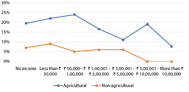Figure 16 shows that the largest number of respondents with land disputes (24 per cent) were those with a dispute about agricultural land and an annual income between Rs 50,000 and Rs 1,00,000. It is pertinent to note that people with land disputes and belonging to a higher-income (Rs 5,00,000 and above) category have only had disputes about agricultural land, and not disputes about non-agricultural land.