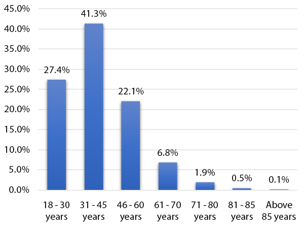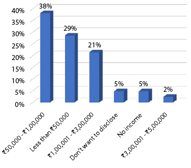 In addition to the percentage of male and female respondents shown in Figure 2, 0.04 per cent of respondents were transgenders and 0.05 per cent of respondents said they did not want to disclose their gender.