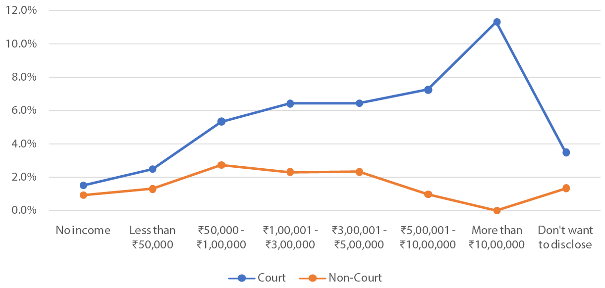 In terms of income levels, most people from middle- to high-income categories (annual income of Rs 3,00,000 and above) prefer to use the court system, while most people relying on non-court mechanisms are from lower income categories. This suggests that cost is a deterrent for approaching the courts for people with low income.