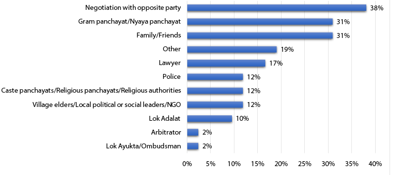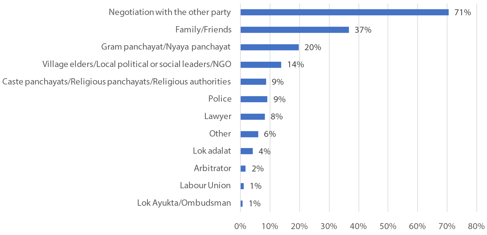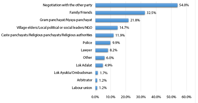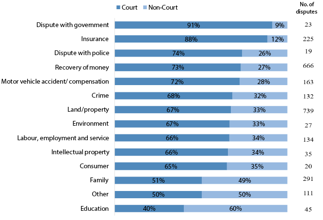 Courts were the most predominant means of conflict resolution (vis-à-vis non-court mechanisms) for disputes with the government (91 per cent) or police (74 per cent) and insurance related cases (88 per cent), perhaps because there are very few non-court avenues to resolve such issues.