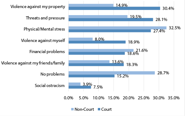32 As shown in Figure 29, a high percentage of people who used the court mechanism faced violence against themselves, friends and family, their property, threats and pressure, and social ostracism. Physical and mental stress, as well as financial problems were widely prevalent overall, as a consequence of both court and non-court related disputes. However, a higher percentage of respondents who used non-court mechanisms (28.7 per cent) felt that they did not face any problems as a result of their dispute.