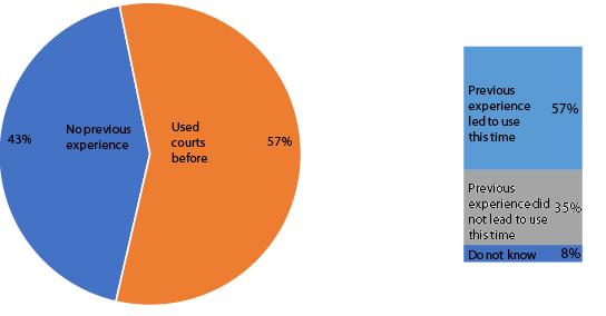 Around 57 per cent of respondents who went to court had prior court experience, and of those, about 57 per cent said that their court experience had led them to approach court again.
