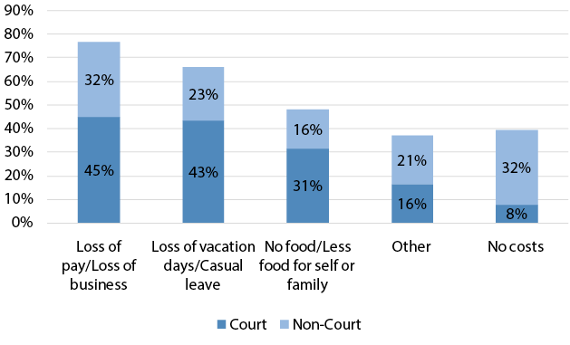 Other than legal fees and court fees, there are numerous indirect ways in which people are financially affected by disputes. When compared with respondents who elected non-court mechanisms, a higher percentage of people who went to court incurred costs due to loss of pay or loss of business (45 per cent), loss of vacation days or leave (43 per cent), and a shortage of food (31 per cent). Further, a large number of those who used non-court mechanisms (32 per cent) said they did not face any costs in participating in the dispute resolution process.