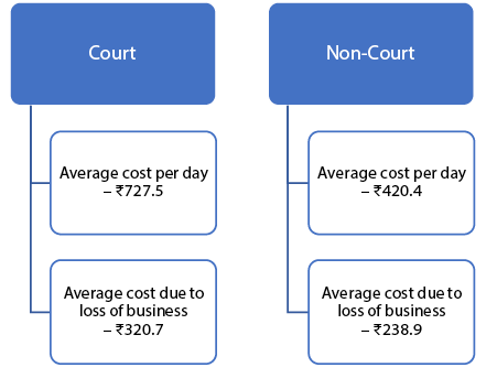 Personal costs that the litigants bore while engaging with courts were found to be significant. People who went to court incurred on an average, a cost of around Rs 1,049 per day, with Rs 728 being direct costs, and Rs 321 being due to loss of business. In contrast, people who adopted out-of-court methods spent a little more than half that amount, at Rs 659, split between Rs 420 as direct costs, and around Rs 239 due to loss of business. This could be why almost one-third (32 per cent) of respondents who had a dispute, and wanted to resolve it, relied on non-court methods.