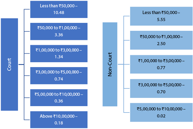 Of the 5.8 per cent of respondents who had a dispute and said that they wanted to resolve it, around 70 per cent of these respondents said they wanted to go to the court, with the remainder opting for non-court methods. Extrapolating this to India’s adult population,6 we can say that around 4.42 crores of the Indian people (5.8 per cent of the adult population) look to resolve their disputes, and approximately 3.04 crore people (around 4 per cent of the adult population) approach the court system, while approximately 1.52 crores (around 2 per cent of the adult population) prefer non-court mechanisms.