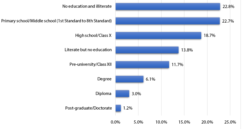 Despite a strict method of random sampling, we found that the proportion of respondents across various religions did not match the proportion of the population belonging to different religions as found in the 2011 Indian census. While 80 per cent of the population is Hindu as per census data, in our data sample, 85 per cent were found to be Hindu. While 14 per cent of India’s population is Muslim, in our survey, 7 per cent of respondents were found to be Muslim. However, the proportion of respondents who were Christian (2.8 per cent) is similar to the proportion in the census (2.3 per cent). The same is true for the Jain community (0.7 per cent in our survey, compared to 0.37 per cent in the census), and the Buddhist community (0.8 per cent in our survey, as compared to 0.7 per cent in the census). In comparison, in last year’s survey, 79.8 per cent of respondents were Hindu, 9.8 per cent were Muslim, 5.6 per cent were Christian, 3.2 per cent were Jain, Sikh, and Buddhist, while the remaining 1.6 per cent were from other religions or did not disclose their religion.9
