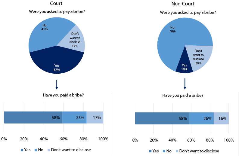 Of the 42 per cent of respondents who went to court and were asked to pay a bribe, 58 per cent admitted to paying one. Of the 10 per cent of respondents who chose non-court mechanisms, 58 per cent admitted to paying a bribe.