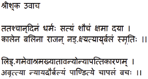 External marks will be the only means of knowing the asrama or stage in life (of an individual) and the (only) guide in determining the mode of greeting which people should adopt when meeting one another. Justice will have every chance of being vitiated because of one’s inability to gratify those administering it, and voluble speech will be the (only) criterion of scholarship.6