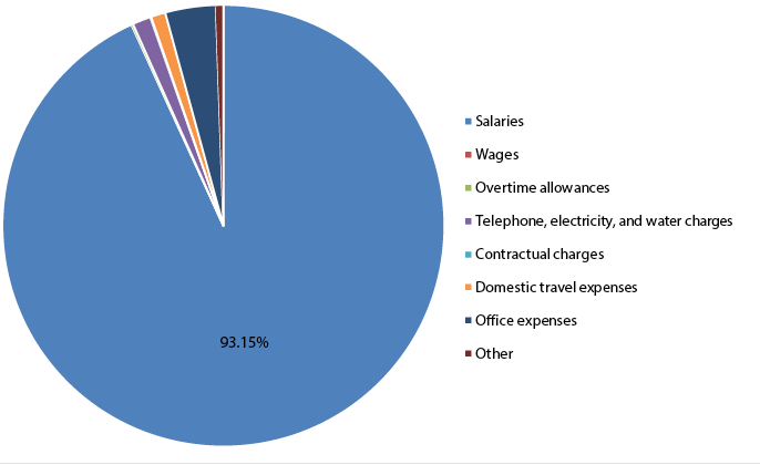 228 Over 93 per cent of the Rs 1,044 crores is spent on salaries of judges and other permanent staff working at the district and sessions courts. The remaining 7 per cent of the budget is allocated to other operating costs, such as office expenses (3.7 per cent), utilities (1.35 per cent), travel (1.05 per cent), etc. These costs leave no room for financing training, digital upgradation, or other capacity-building initiatives.