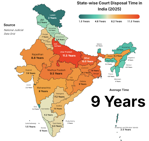 India’s judiciary, a constitutionally mandated pillar of democracy, exemplifies a pure public good characterised by non-excludability and non-rivalry. This study examines judicial efficiency as public good provision, analysing empirical data from 2018 and 2024 to document a deepening crisis in access to justice. Using data from the National Judicial Data Grid (NJDG), DAKSH database, this research reveals that despite a 43% increase in budget allocations, total case pendency has risen 59% to over 5 crore cases, average case duration to disposal has increased by almost 9 years. The annual economic costs borne by litigants are exceptionally high—estimated at approximately ₹80,000 crore in 2016—and, when adjusted for subsequent inflation and wage growth, are likely to be substantially greater today. The analysis demonstrates that 93.5% of judicial expenditure is borne by state governments and the balance by the centre. Annually, India spends an average of 0.08%, with states spending a mere 0.54% of their total expenditure.